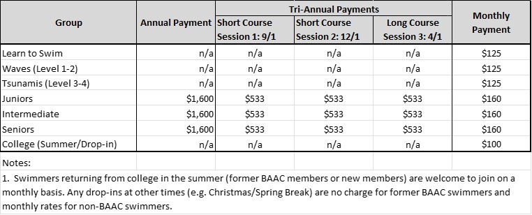 - All Competitive Group swimmers joining BAAC will be required to purchase a USA Swimming membership for the year as follows: